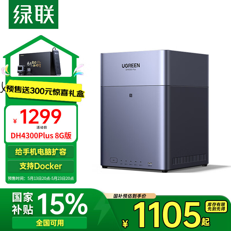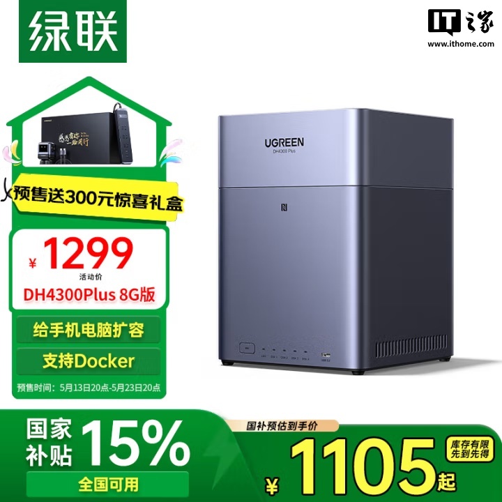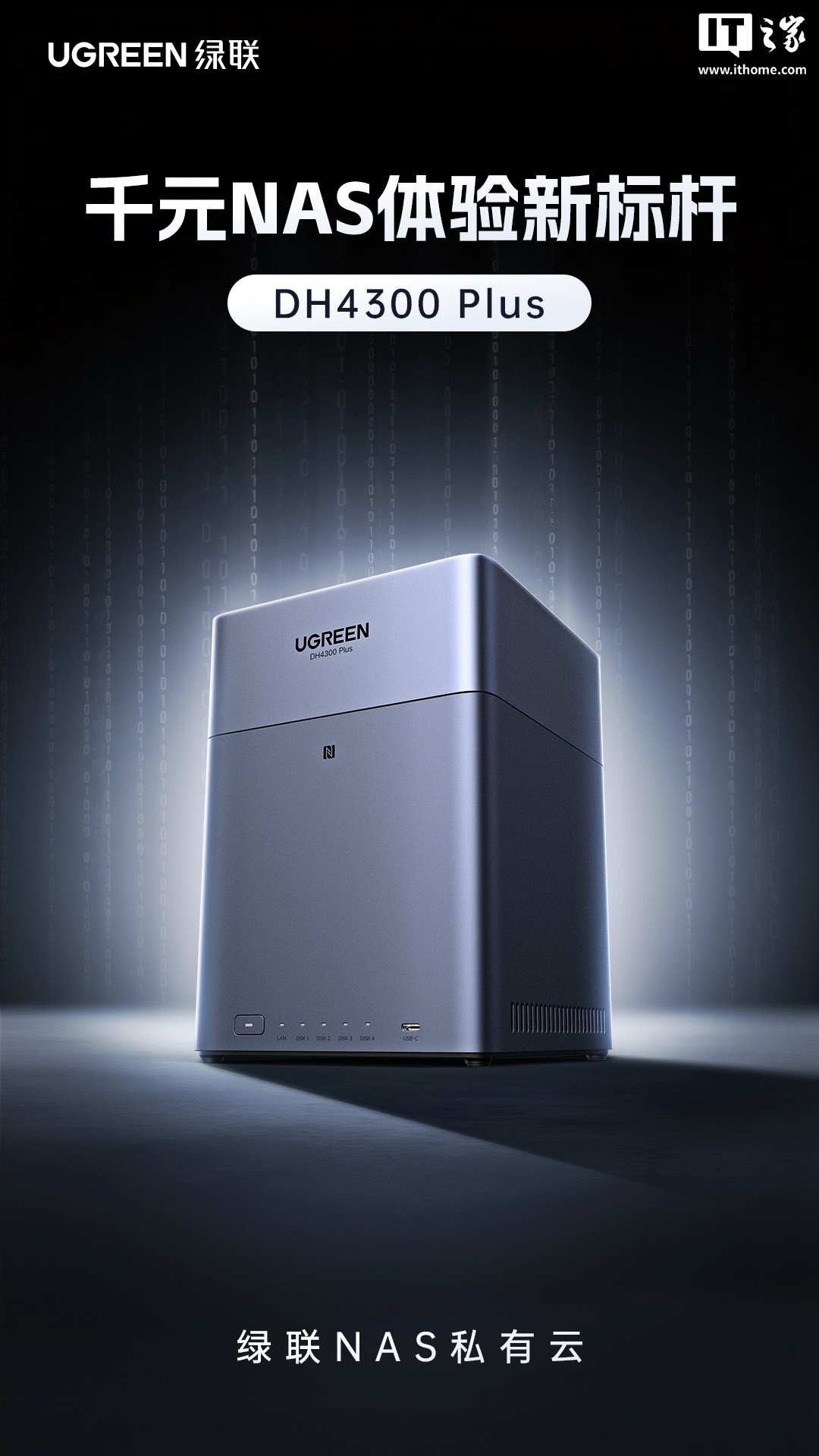 IT之家 5 月 13 日消息,绿联 NAS 私有云家族新成员 DH4300 Plus 发布,今晚 20:00 京东首发,空盘版售价 1299 元,国补预估到手价 1105 元起。