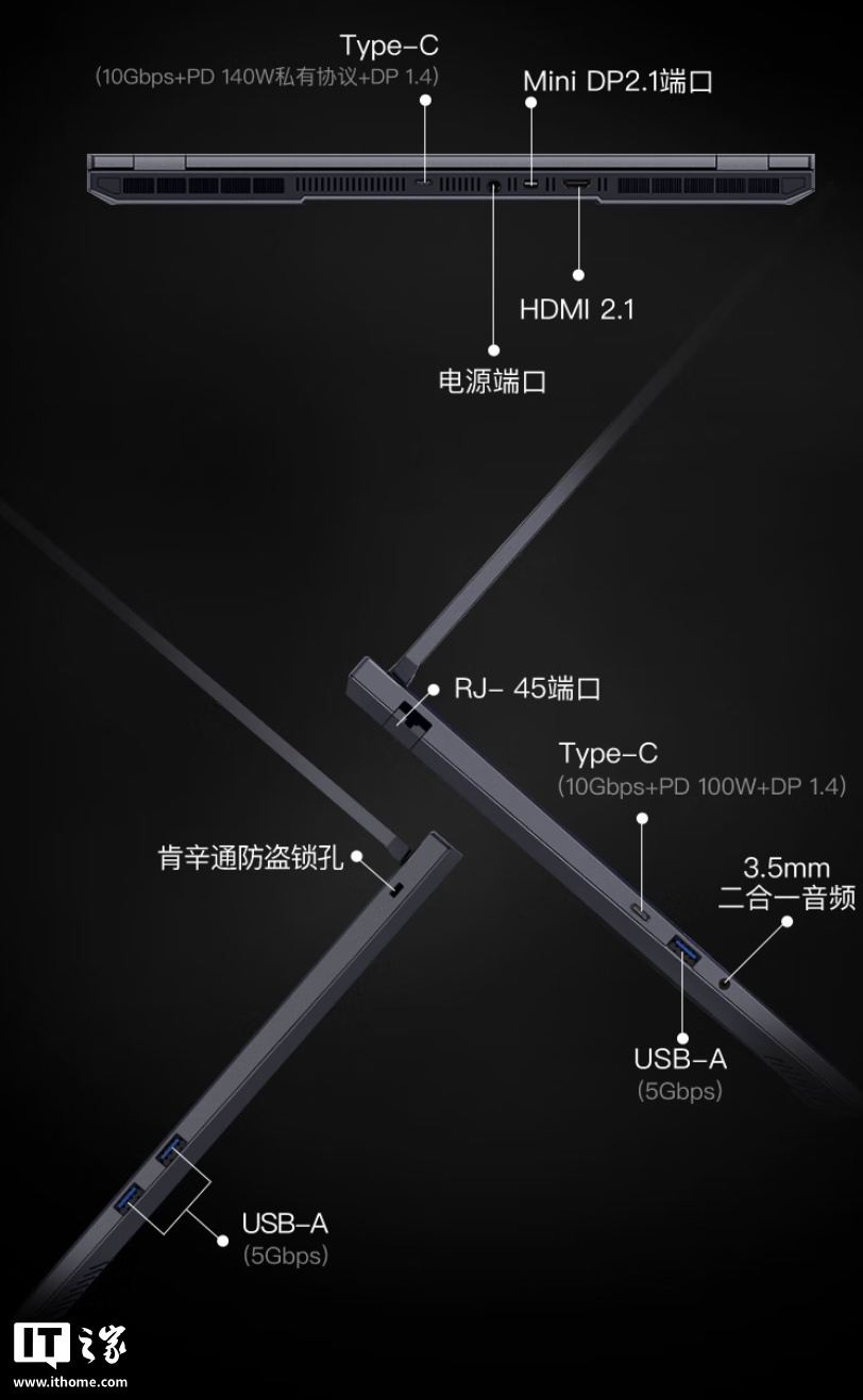 IT之家注意到,这款笔记本 A 面采用航空级铝合金材质,带有机械革命 Logo,笔记本拥有 Nahimic 音效优化,内置 80Wh 电池(支持 140W 私有协议 PD 快充和 100W PD 标准协议),提供 250W SiC 电源适配器。