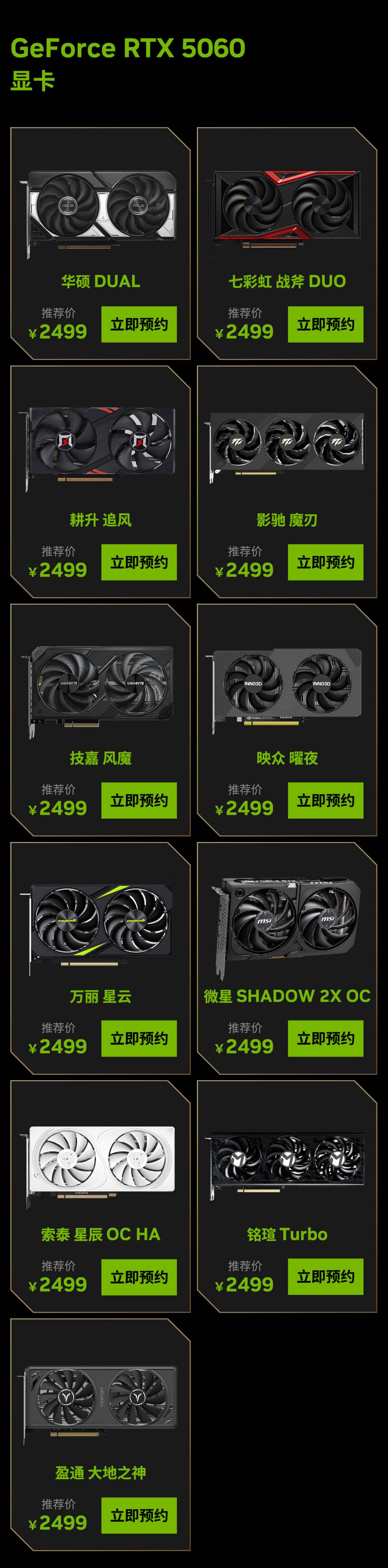 IT之家注意到,所有英伟达 AIC 合作伙伴均提供了一款标价为 RTX 5060 起售价 2499 元的产品,包括华硕 DUAL、七彩虹战斧 DUO、技嘉风魔、微星 SHADOW 2X OC 等,其中大部分都是双风扇款式,也有影驰魔刃、铭瑄 Turbo 这两个三风扇型号。