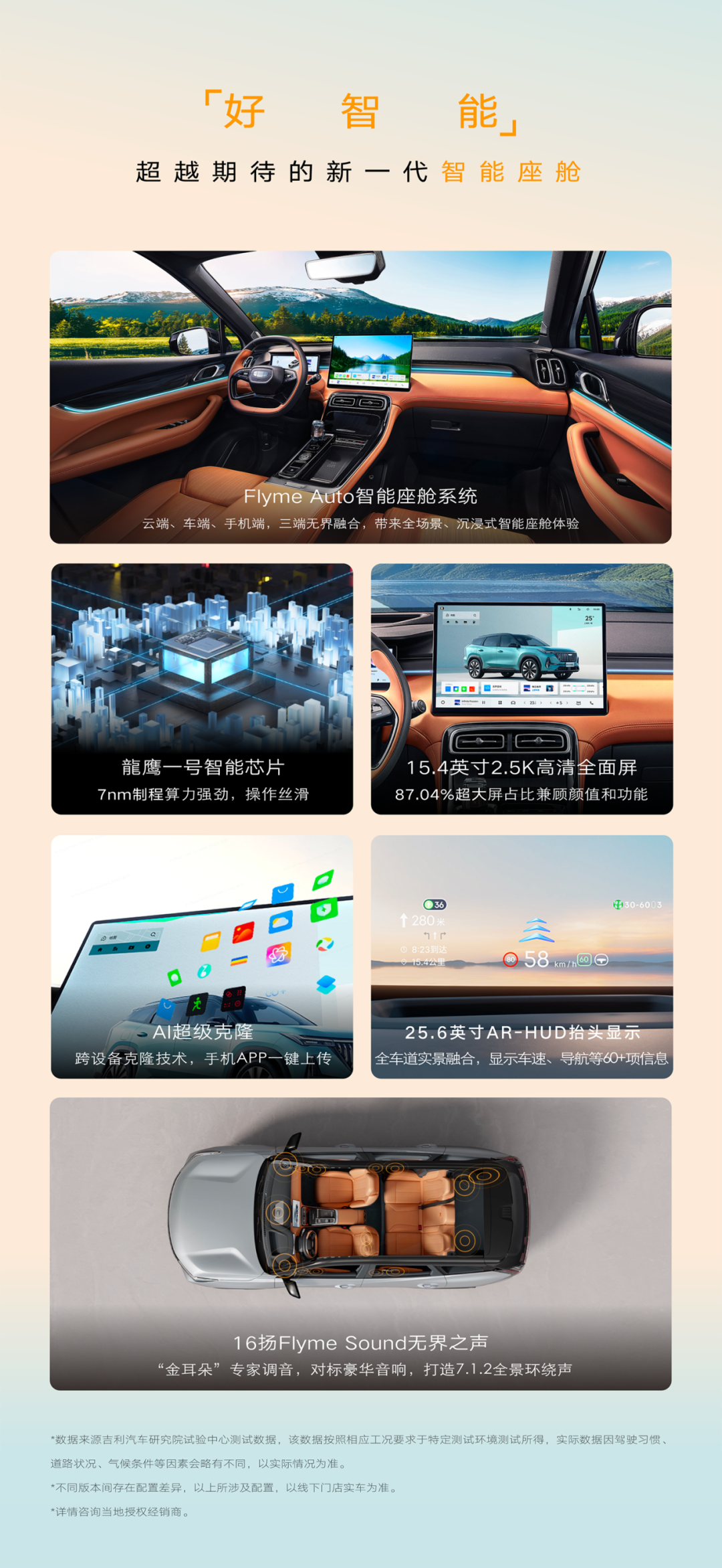 座舱方面,该车搭载新一代 CMA 智能架构,全系标配 Flyme Auto 智能座舱系统,采用 15.4 英寸 2.5K 高清全面屏(采用国产首颗车规级 7nm 龍鹰一号芯片,配备 16+128G 存储空间,可提供 8155 芯片 2 倍的 AI 算力),支持 UI 界面、图标设置、场景助手等多项自定义设置。