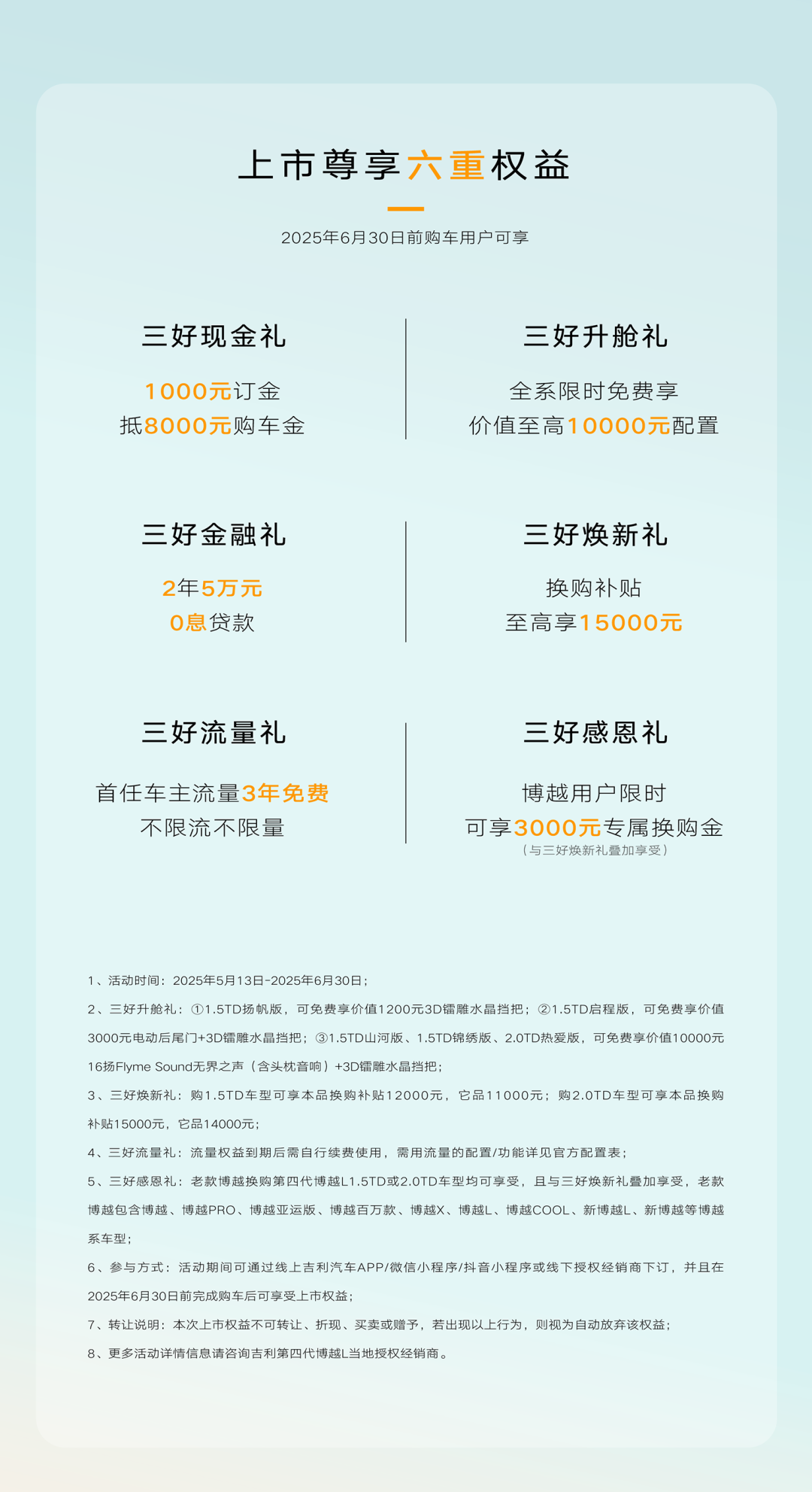 该车上市可享六重权益,包括 1000 元订金抵 8000 元购车金,全系限时免费享价值至高 10000 元配置等。