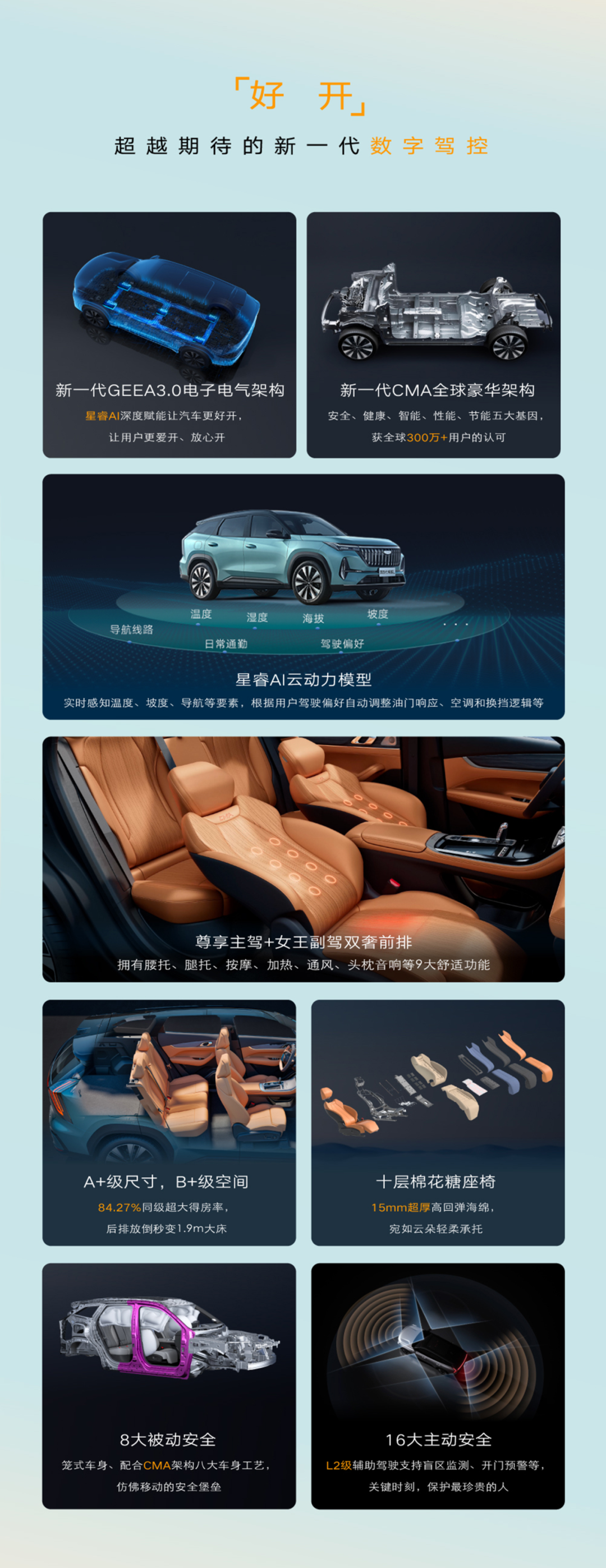 该车长宽高为 4730*1910*1710mm,轴距 2785mm,配备“百川归海”前格栅、后贯穿灯、环抱式座舱,采用新一代 CMA 架构、新一代 GEEA3.0 电子电气架构。