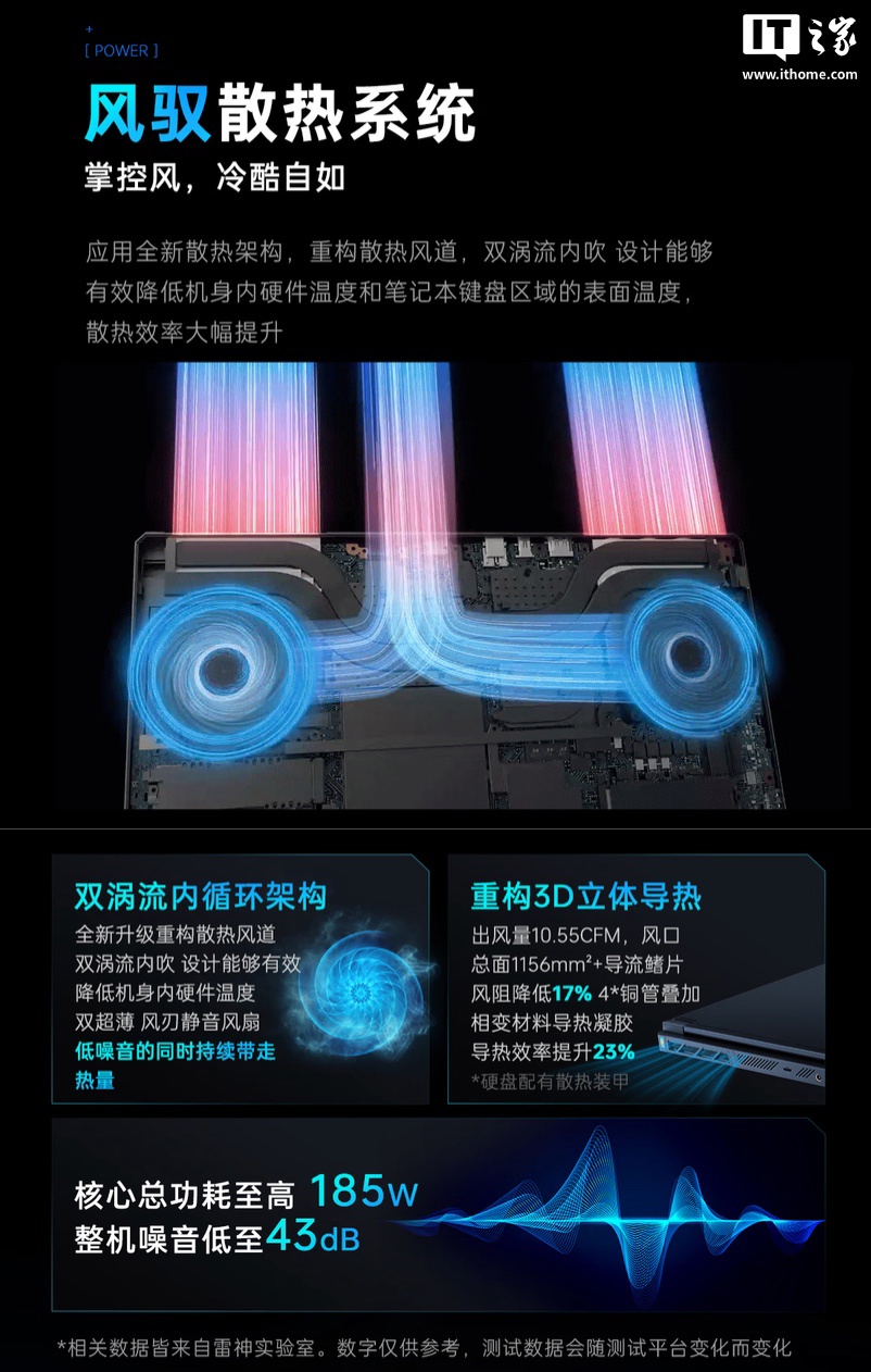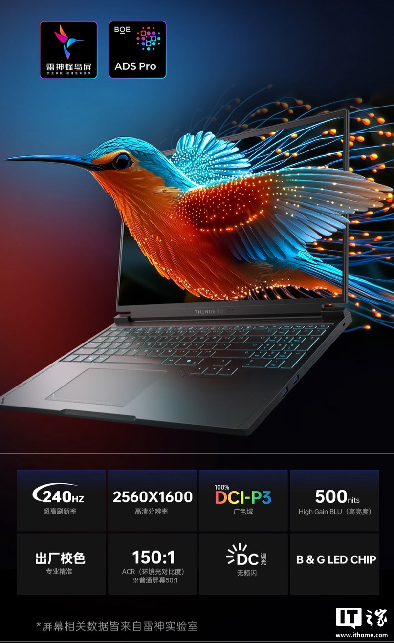 该机 A 面配备镜面雷神 Logo,侧面带有雷神铭牌,笔记本支持 180 度开合,提供下沉式全尺寸 RGB 键盘,内置 80Wh 电池(IT之家注:支持 140W 快充)。