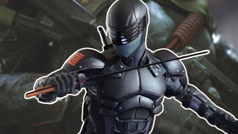 Snake Eyes 的面具并未显示,但黑色服装上的绿色亮点清晰可见,营造出神秘而致命的氛围。剑刃上刻有 Arashikage Clan 的标志,这是一个重要符号,强化了角色的忍者背景。从图片判断,Snake Eyes 的设计很可能参考了 1985 年 Hasbro 发布的版本 2 玩具。