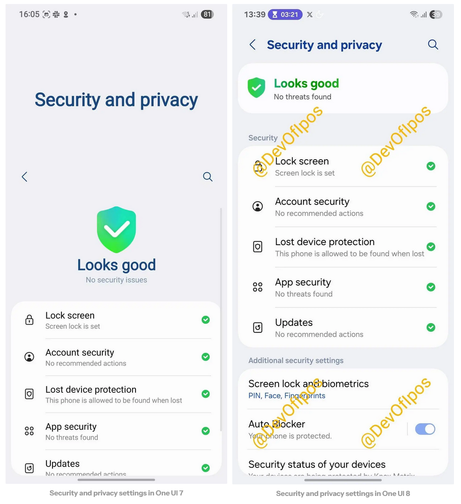 One UI 8 还微调隐私和安全设置页面,缩小原设计中的盾牌图标,并置于一个圆角矩形卡片内,下方添加了“Security”标题,强化了视觉层次。