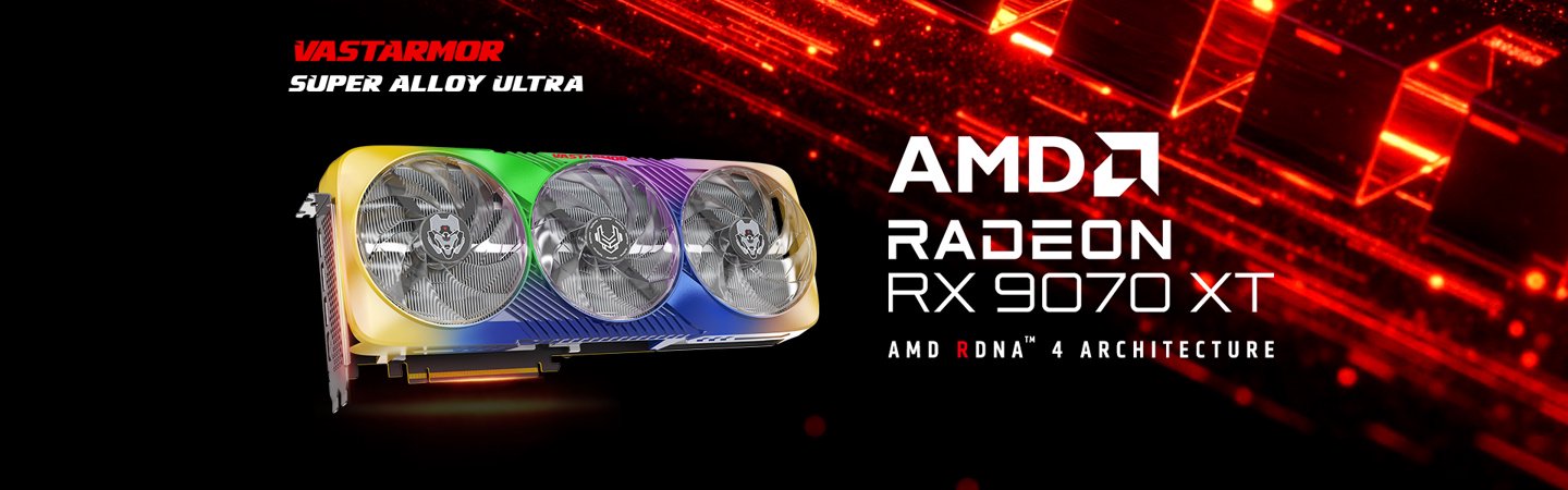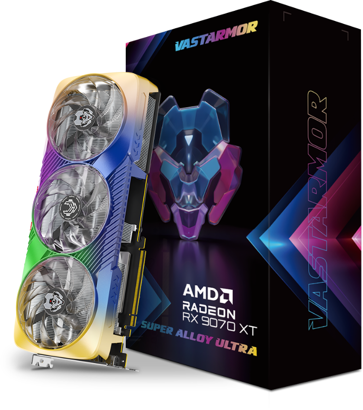 IT之家 5 月 14 日消息,瀚铠 VASTARMOR 官网现已上线 Radeon RX 9070 XT 超合金 ULTRA 显卡。此前的本世代“超合金”型号均采用纯色正面外壳搭配 ARGB 风扇的设计,而在更高等级的“超合金 Ultra”上则变为了彩虹风格多色外壳。