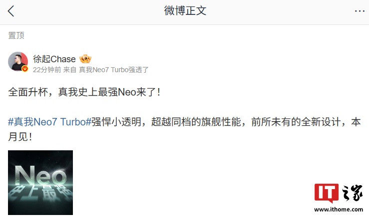 IT之家 5 月 14 日消息,realme 真我手机官方今日发文宣布:真我史上最强 Neo —— 真我 Neo7 Turbo 手机“本月见”,号称“强悍小透明”。