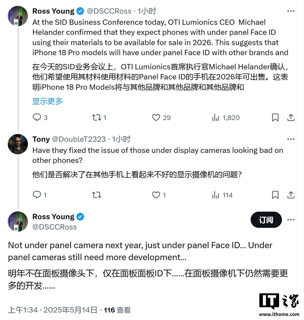 IT之家 5 月 14 日消息,屏幕供应链咨询公司 DSCC 首席执行官罗斯・杨(Ross Young)今天在 X 平台发布推文,曝料称苹果 iPhone 18 Pro 系列机型将采用屏下 Face ID 系统。