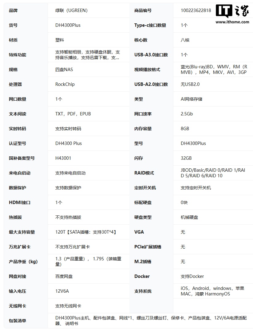 据IT之家了解,绿联 NAS 私有云 DH4300 Plus 搭载 A55-A76 8 核处理器,拥有 4 SATA 盘位,单盘最大支持 30TB,最高支持 120TB 存储空间。