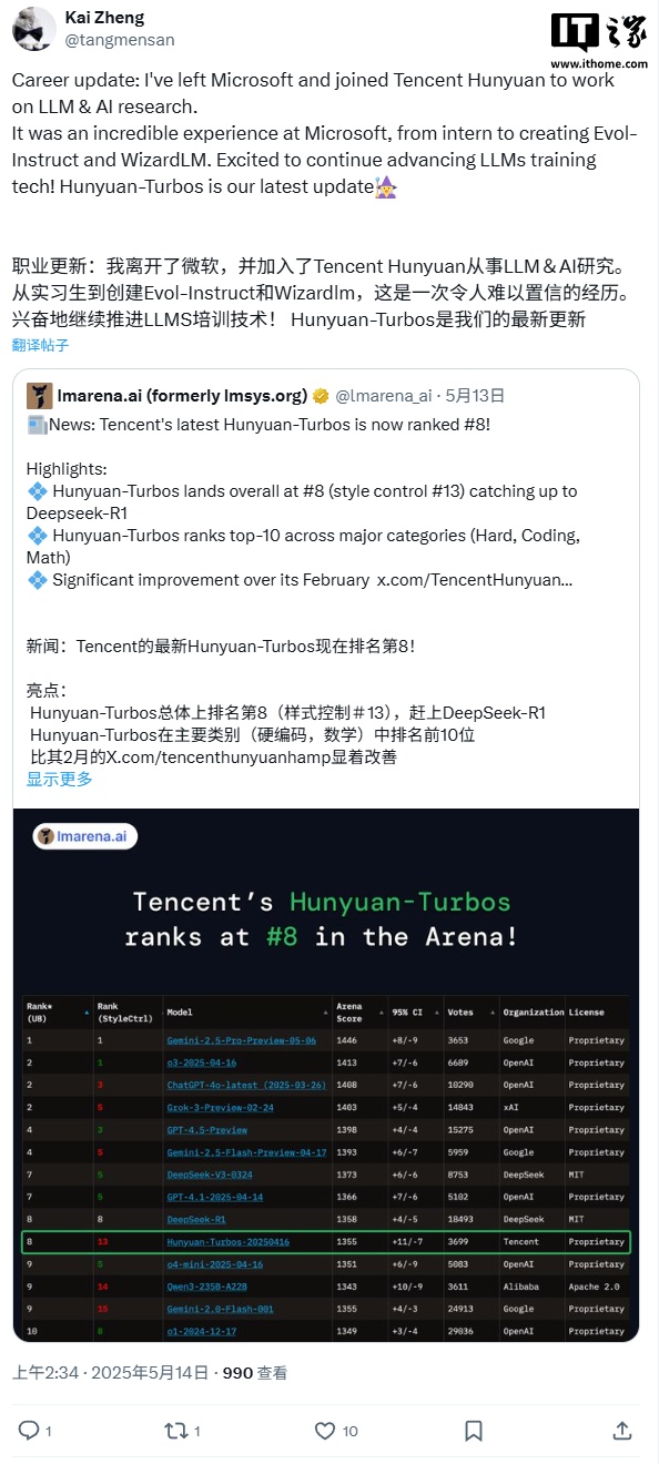 IT之家 5 月 14 日消息,专注于高级大语言模型开发的 WizardLM 项目创建者徐灿发文称,他和团队已离开微软并加入了腾讯 AI 团队 —— 混元。