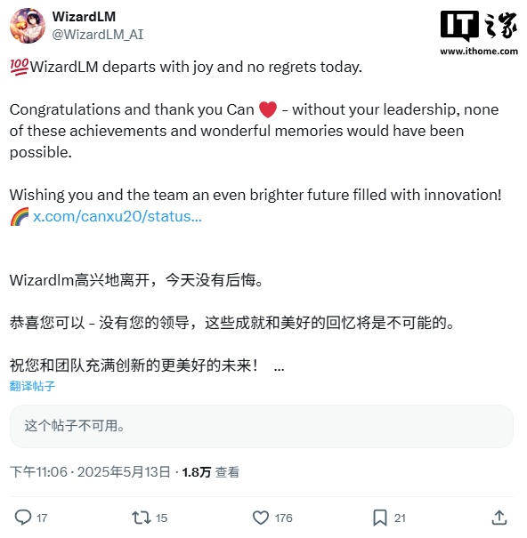 IT之家注意到,WizardLM 官方账号也发文表示祝贺,“没有你的领导,所有这些成就与美好回忆都将无法实现。祝愿你和团队迎来更加光明、充满创新的未来!”