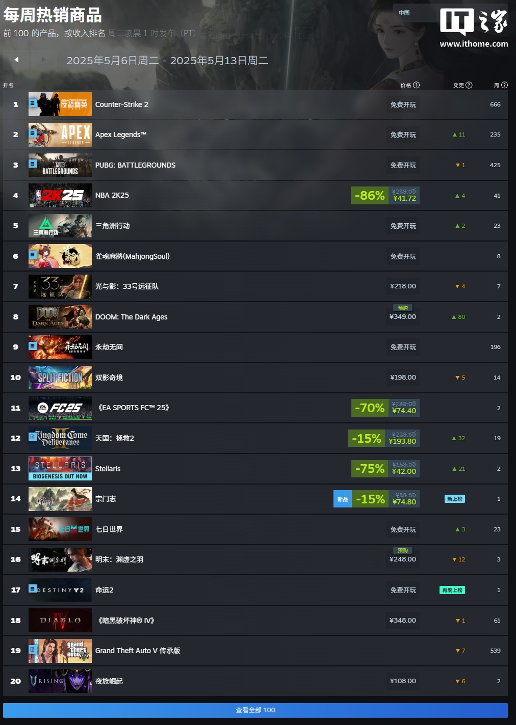 IT之家 5 月 14 日消息,Valve 昨晚公布了 Steam 最新一周(5 月 6 日至 13 日)的销量排行榜,新发售的《光与影:33 号远征队》实现二连冠。