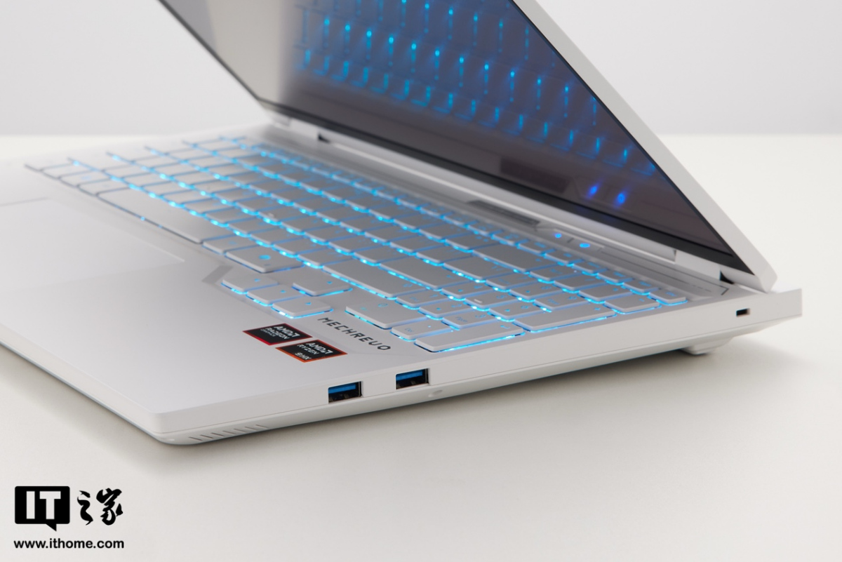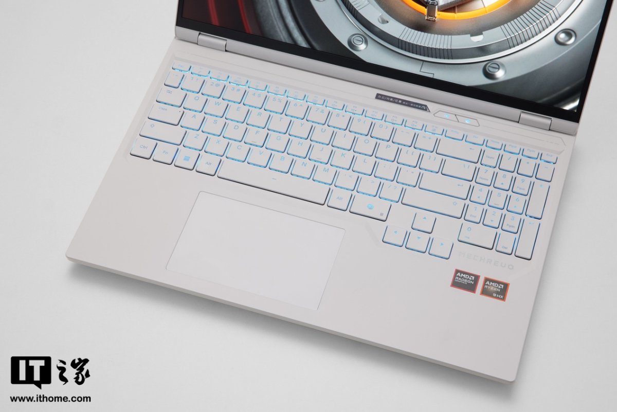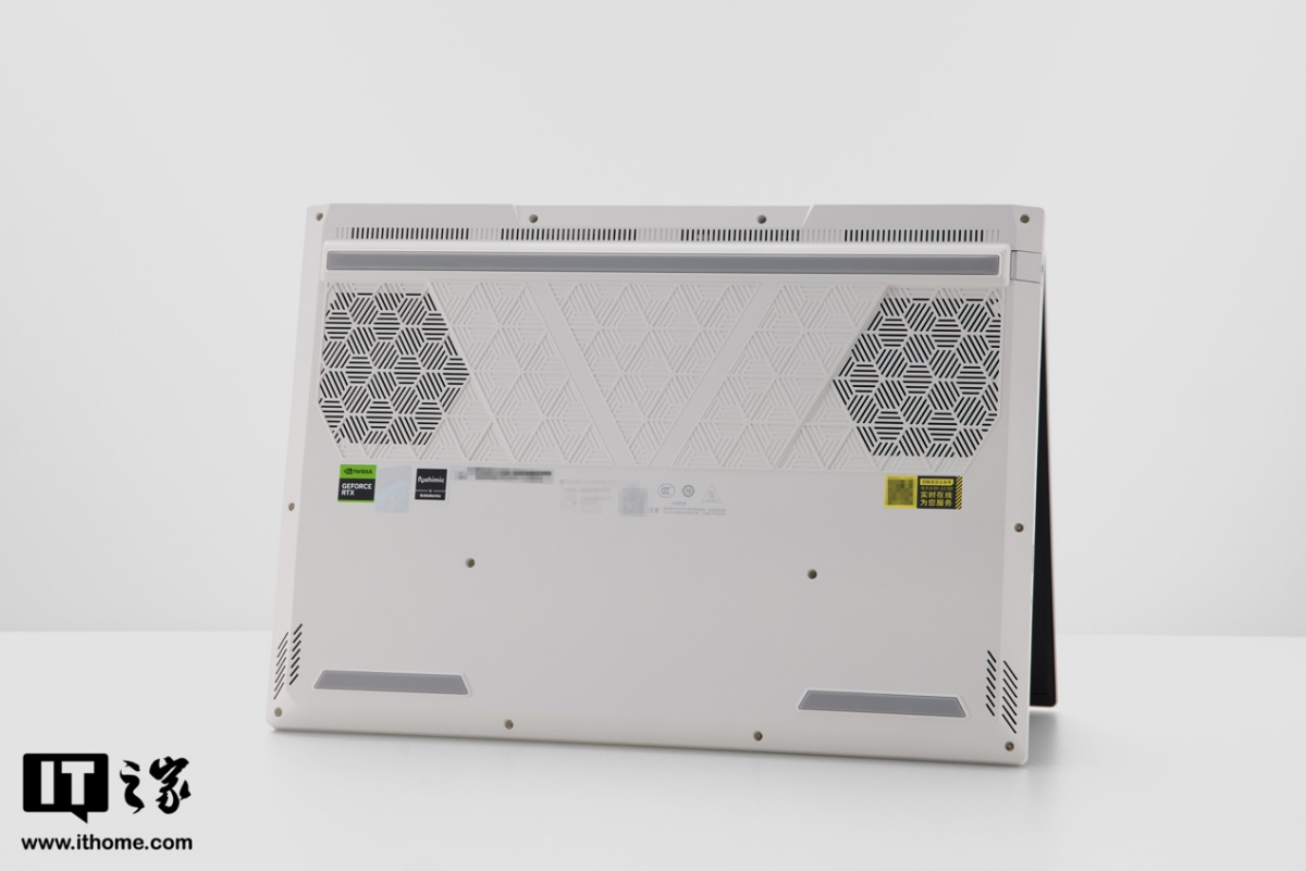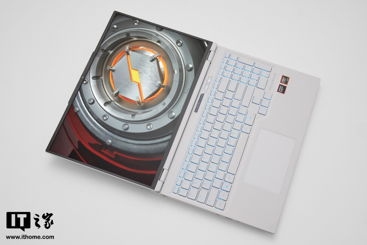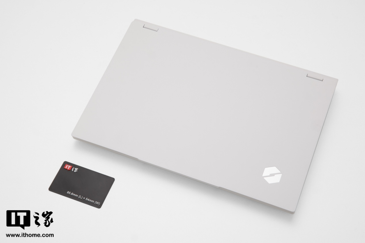 IT之家拿到的这款是浅色风格,A 面非常简约,一改前代的居中发光 Logo + 立体装饰线条的风格,仅有一枚侧置的镜面机械革命 Logo。