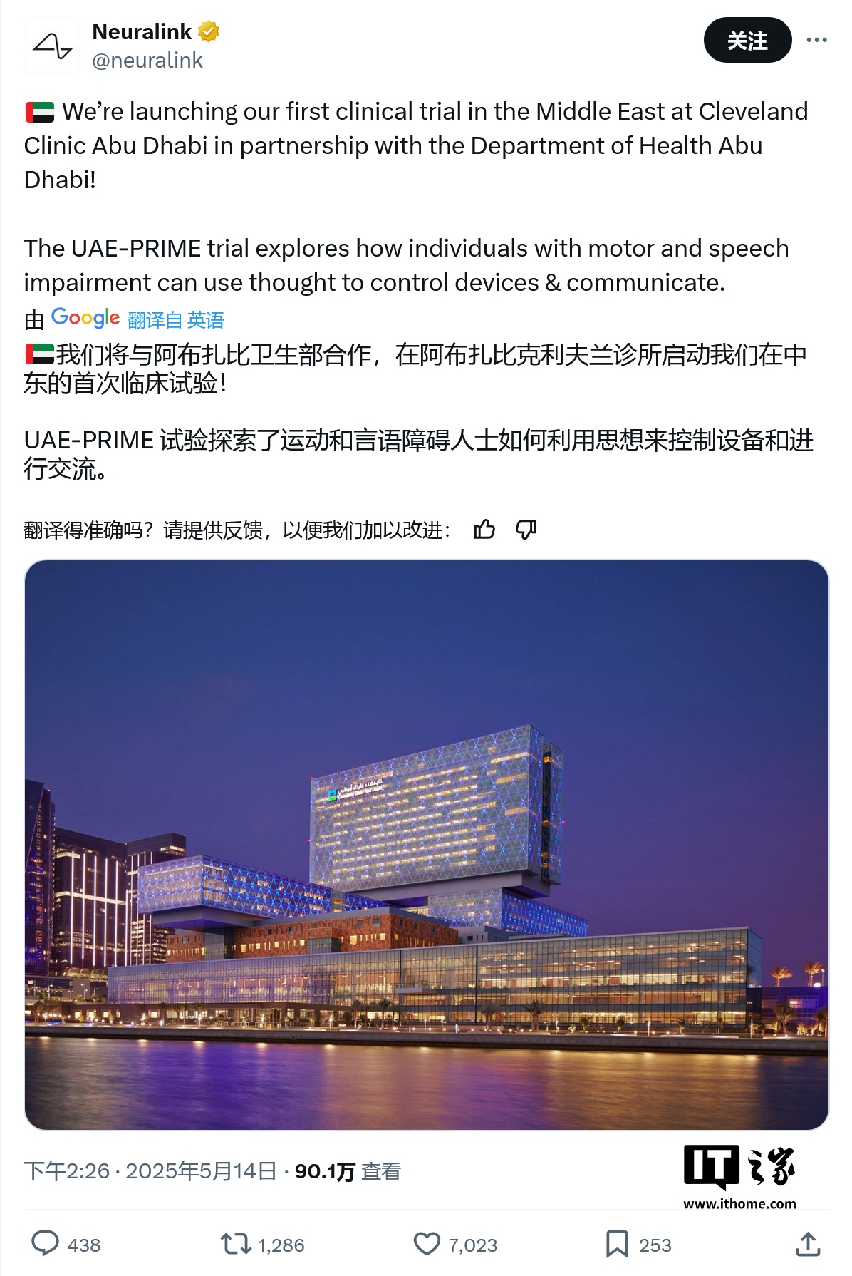 IT之家 5 月 15 日消息,Neuralink 官方账号昨日(5 月 14 日)在 X 平台发布推文,宣布联合阿布扎比卫生部,在阿布扎比克利夫兰诊所内,将启动其在中东的首次 UAE-PRIME 脑机接入临床试验。