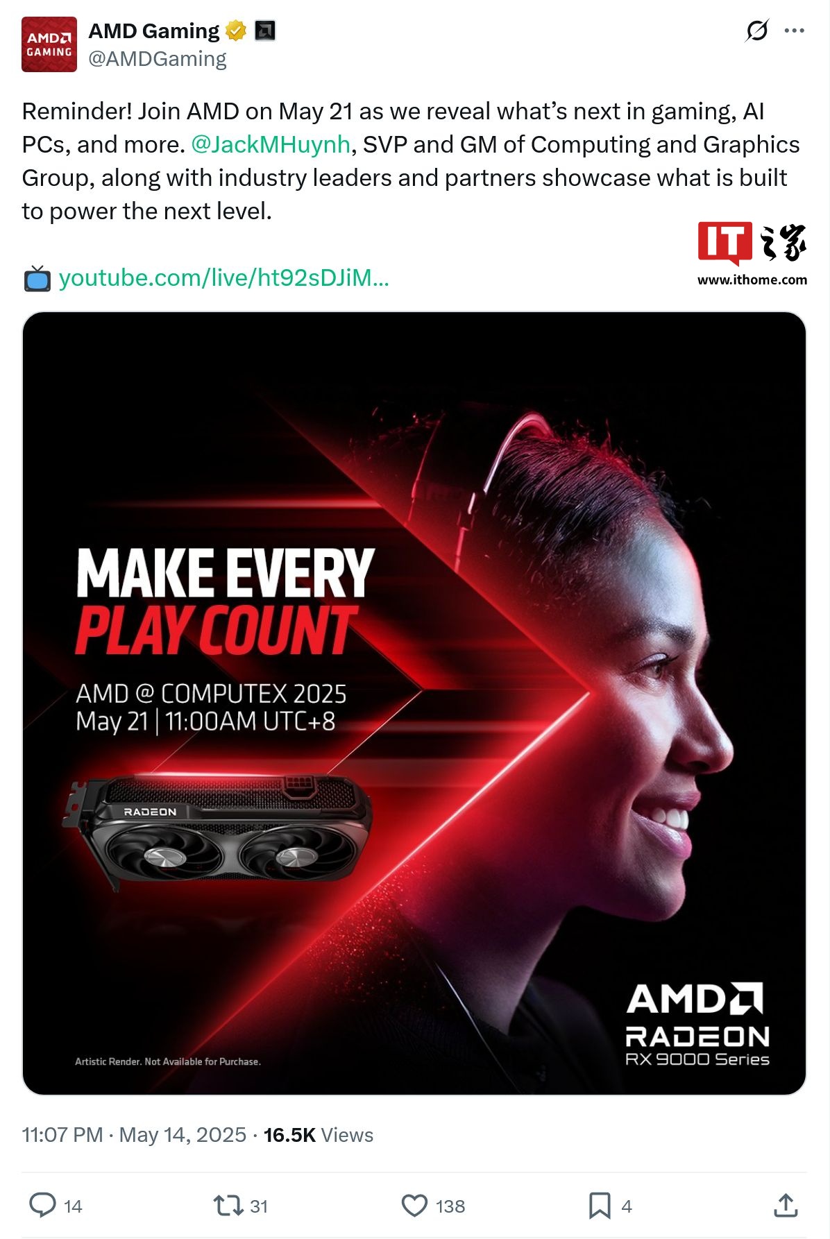 IT之家 5 月 15 日消息,AMD 在其北京时间昨日深夜发布的企业 COMPUTEX 2025 新闻发布会预热社交媒体预热动态中展示了一款显卡的渲染图。