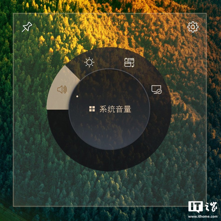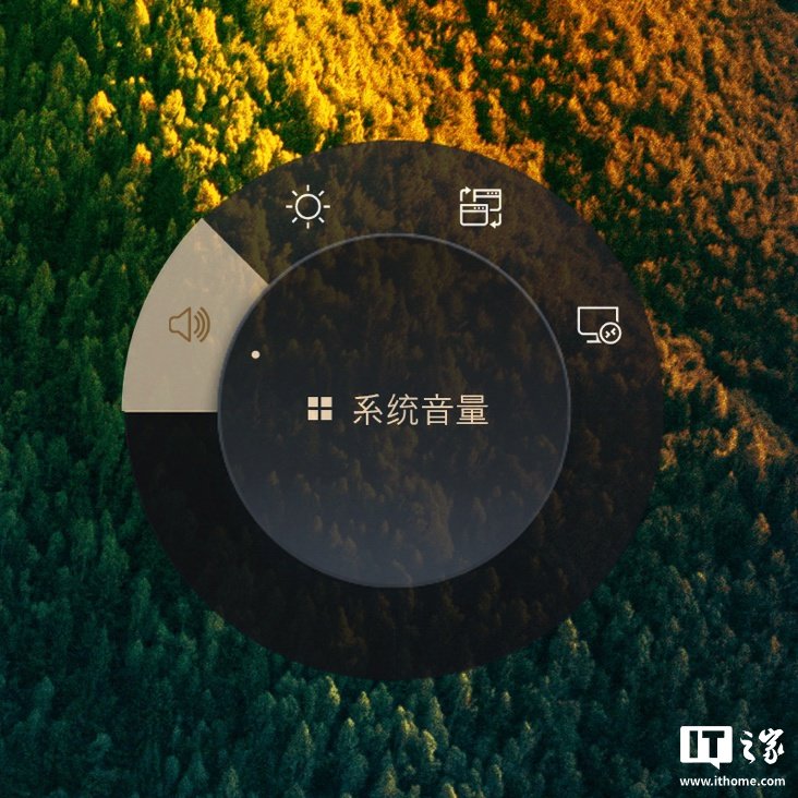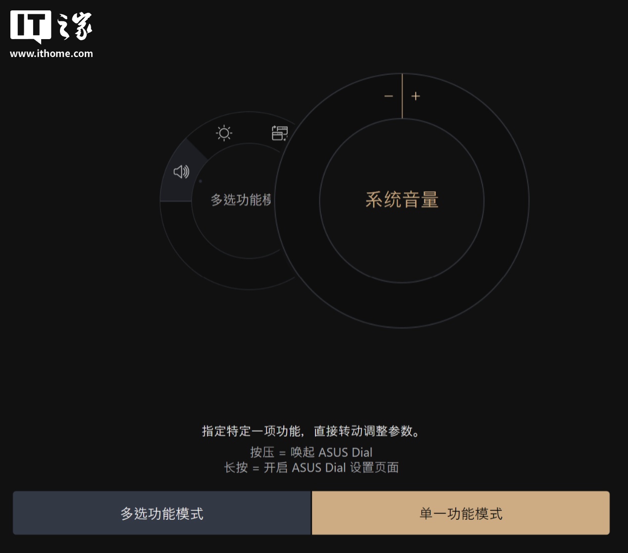 创意旋钮默认状态下激活的是系统功能,比如调节系统音量、屏幕亮度、切换桌面等操作。交互方面,华硕创意旋钮分为点按、长按和滑动三种交互方式。点按会弹出圆形的旋钮快捷菜单,接着滑动旋钮外圈可以切换功能,切换到对应功能后点按旋钮内圈即可锁定,而长按旋钮内圈则是打开旋钮控制台。