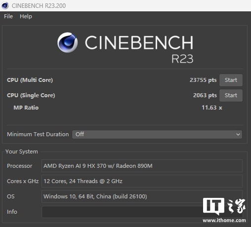 在 CineBench R23 的测试中,AMD Ryzen AI 9 HX 370 处理器跑出了单核心 2063 分,多核心 23755 分的成绩,相比上一代 8945HS 处理器的多核心成绩(17339 分)领先 37%,单核心成绩则要多出 200 分以上。