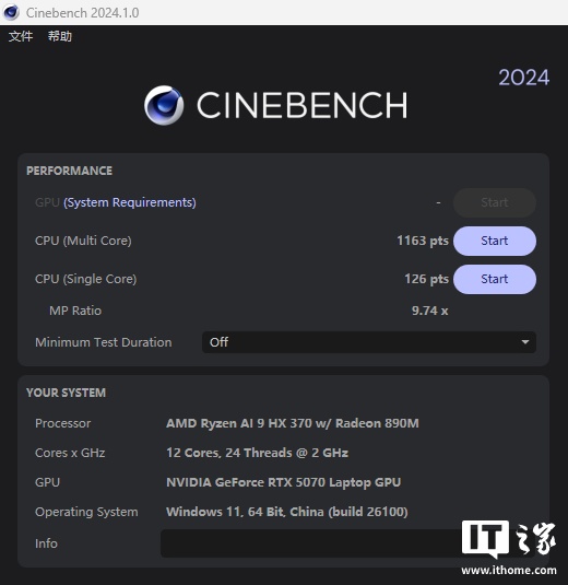 在 CineBench R24 的测试中,AMD Ryzen AI 9 HX 370 处理器跑出了单核心 126 分,多核心 1163 分的成绩,单核心成绩与桌面级的锐龙 9 7950X 比较接近,而多核心性能也属于 80W 功耗下的正常水平。