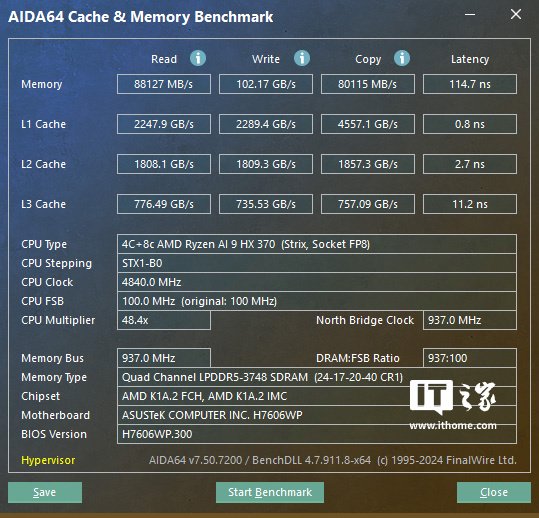 内存为板载 64GB 双通道 LPDDR5X 7500MT/s 规格,读取和拷贝速度均为 80000MB/s 以上,写入速度达到了 102GB/s,内存延迟为 114.7ns,L3 缓存延迟为 11.2ns。