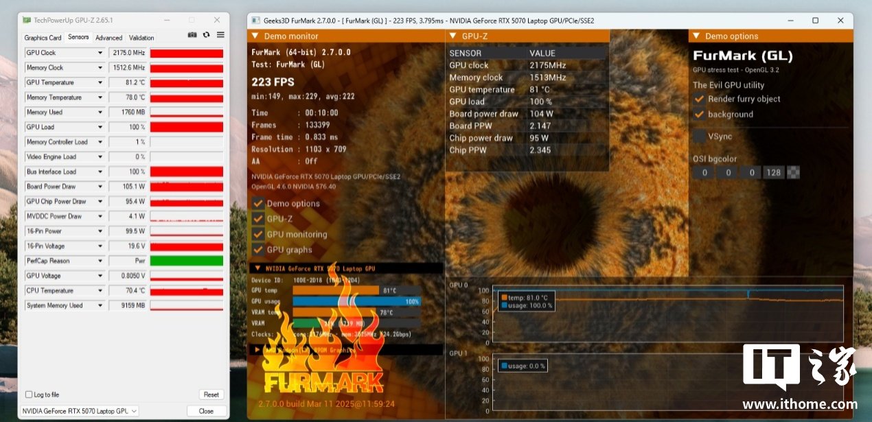 接着单烤 10 分钟的 GPU,此时 GPU 功耗保持在 105W 上下,GPU 温度为 81.2℃,显存温度 78℃,GPU 核心频率保持在 2180MHz 左右。这个功耗和温度表现与上代机型上的 RTX 4070 显卡几乎保持一致,但核心频率提升了 200MHz 以上。