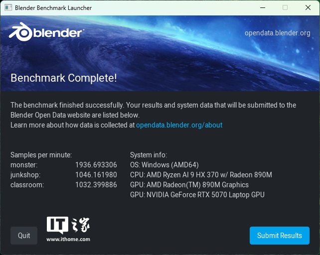 而在另一款专业渲染软件 blender 4.3.0 基准测试中,RTX 5070 显卡的三场景得分如上图所示: