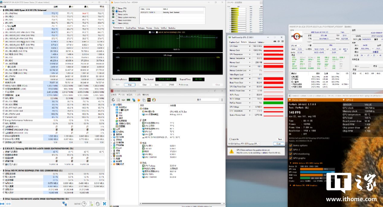 接下来是理论性能测试环节,虽然本次核心配置升级重点是 RTX 5070 显卡,但 AMD Ryzen AI 9 HX 370 处理器的性能表现也不容小觑。