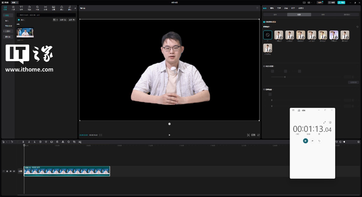 剪映专业版自然也是必测项目,我们事先准备了一段时长为 8 分 14 秒的 4K 出镜视频导入剪映专业版,使用它的 AI 智能抠像功能对人物进行处理,并使用 RTX 5070 的 AI 硬件加速,最终花费 1 分 13 秒就完成了整段视频的抠像。