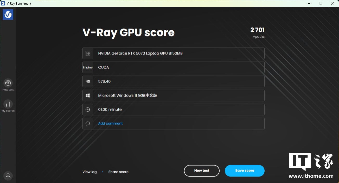 生产力部分我们主要为大家测试了 4 款专业应用中的表现。首先是 V-Ray BenchMark 6,在它的 GPU CUDA 测试项目中,RTX 5070 显卡拿到了 2701 分的成绩;而 GPU RTX 测试项目则拿到了 4001 分的成绩。