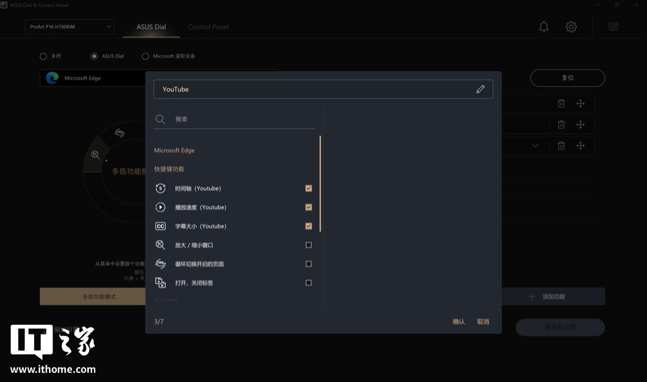 针对不同的软件,旋钮所适配的功能也会跟着变化,例如 Edge 浏览器中可以实现放大 / 缩小窗口,切换标签页,打开关闭标签页以及一些 YouTube 在线视频的调节选项。