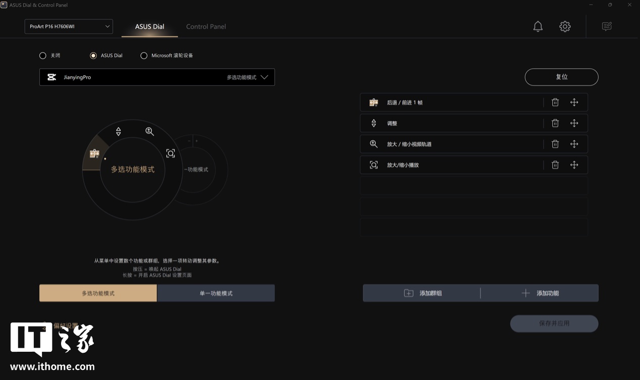 每个软件都支持单一功能 / 多选功能模式两种操作方式选择,用户可以根据自己的使用习惯和需求自行修改,当然,自定义功能也是少不了的。整个华硕创意旋钮的操作空间不小,熟悉后能够给创作者带来不错的效率提升。