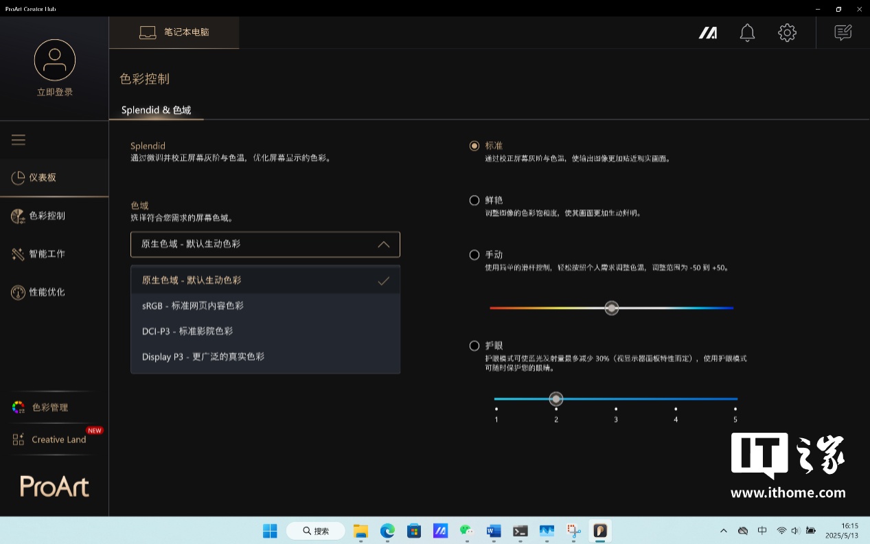屏幕素质可以说是它的消费群体最为关心的地方,为此IT之家进行了实测。测试之前需要通过内置的 ProArt 创作者中心,对显示的色域映射模式进行切换。ProArt 创作者中心色彩控制标签页中,默认采用的是原生色域模式,支持切换为 sRGB 色域、DCI-P3 色域以及 Display P3 色域三种专业显示模式,右侧还提供了色彩风格,色温调节以及护眼等级调节等选项。