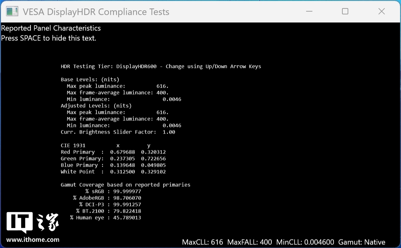 在 Windows 11 系统设置中开启 HDR 模式后,通过 VESA DisplayHDR Test 工具实测,屏幕的峰值亮度为 616nit,在观看 HDR 图片、视频时可以获得更加出色的画面表现力。