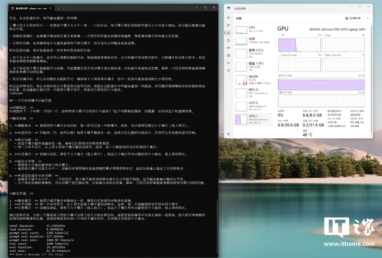 最后我们还测试了本地大模型方面的 AI 性能表现,考虑到 RTX 5070 的显存为 8GB,所以我们在本地通过 Ollama 部署了 DeepSeek R1 的 7b 版本模型用于测试。