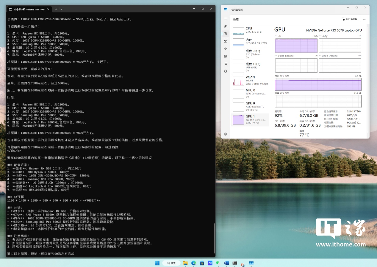 首先向其提问回答时间较长的装机推荐问题,可以看到 DeepSeek R1 模型生成回答内容时,RTX 5070 显卡的 3D 性能直接跑满,8GB 显存也是全程满占用运行,此时 GPU 整体占用为 92%,温度也来到了 77℃。