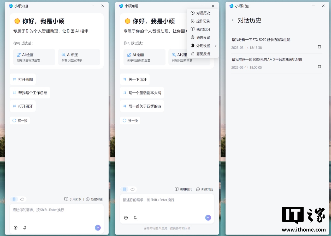 打开“小硕知道”后,它会以类似边栏的形式在屏幕右侧浮窗显示。它的主页非常简洁清爽,上方列举了一些功能入口和使用建议,底部是文字输入框,点开顶部右上角的按钮则可以查看对话历史和操作历史等信息,还有一些简单的设置选项。