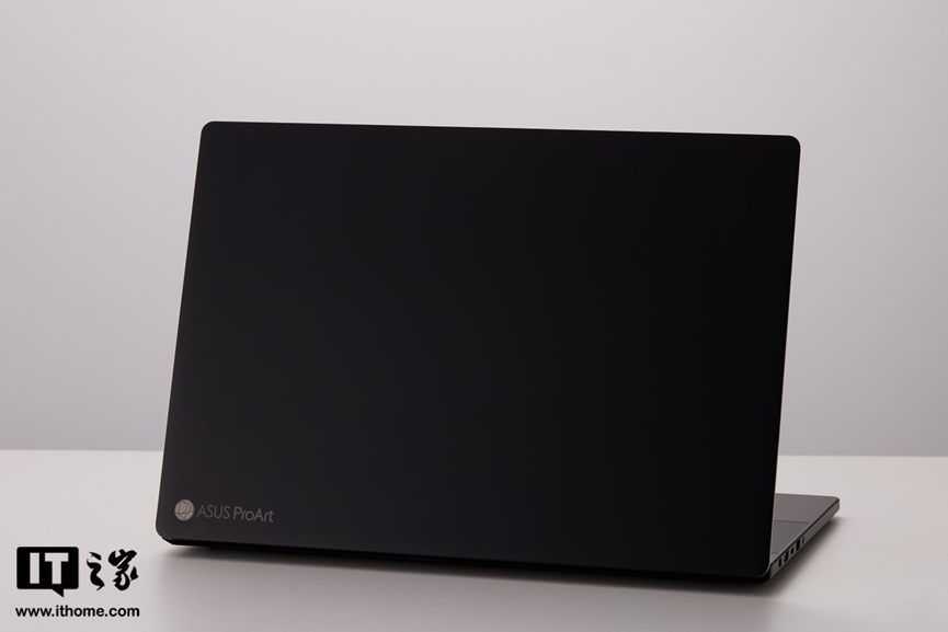 机器 A 面只有左下角的 ProArt Logo 和字母装饰,与上代不同的是 Logo 部分改成了金色边框 + 银白图案搭配,辨识度更高一点。机身线条方正规整,但边缘和四角也都有做过渡处理。