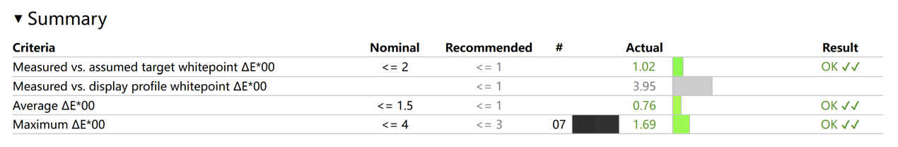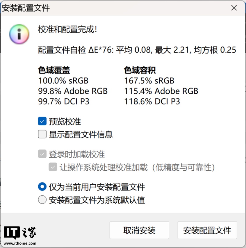 切换到 DCI-P3 色域模式,此时平均 Delta E 为 0.76,最大 Delta E 为 1.69。