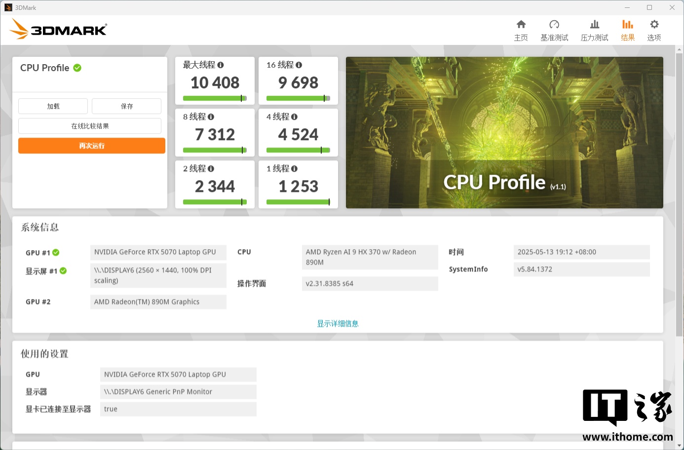 在 3D Mark 的 CPU Profile 测试项目中,AMD Ryzen AI 9 HX 370 处理器的单线程分数 1253 分,最大线程分数 10408 分。