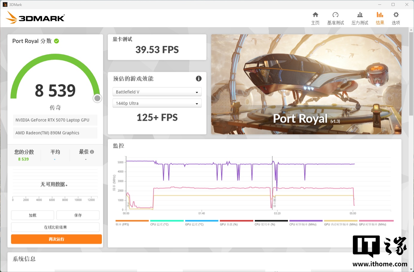 在 3D Mark 的 Port Royal 光追测试中,RTX 5070 综合分数为 8539 分。