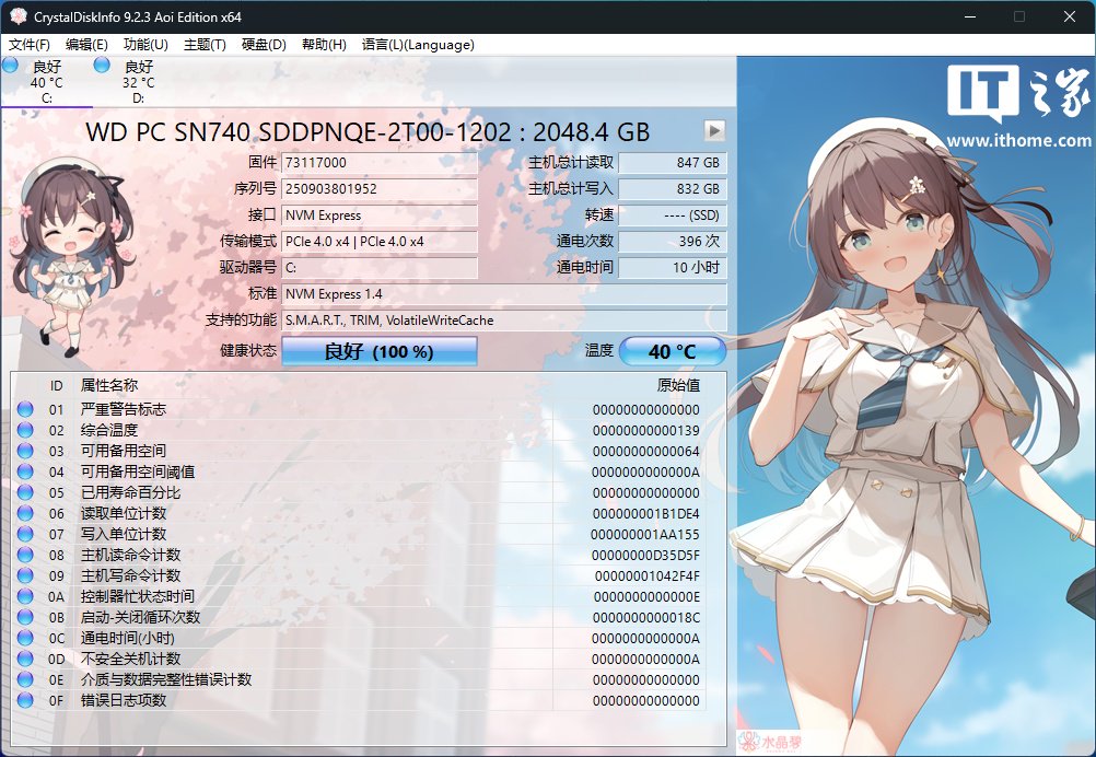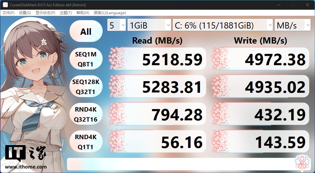 硬盘部分还是 2 个 M.2 固态插槽加单条 2TB 预装硬盘,通过 CDI 查询型号为 PCIe4.0 规格的西部数据 SN740,Crystal Disk Mark 的跑分如图所示,顺序读取速度 5218MB/s,顺序写入成绩 4972MB/s,与早些时候推出的 ProArt 创 X 用的是同款固态硬盘。