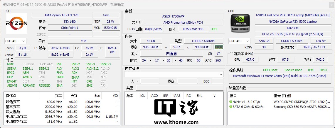 ProArt 创 16 2025 延续了上一代搭载的 AMD Ryzen AI 9 HX 370 处理器,拥有 12 核心 24 线程,最高加速频率可达 5.1GHz,支持 36MB 缓存(L2+L3 缓存)。这款处理器的能耗比表现非常出色,而其内置了基于 XDNA 2 架构的 NPU,可实现 50 TOPS 的算力释放。集成的 Radeon 890M 核显,基于 RDNA 3.5 架构,性能接近移动版 RTX 3050 水平,1080P 画质下可以畅玩主流游戏。