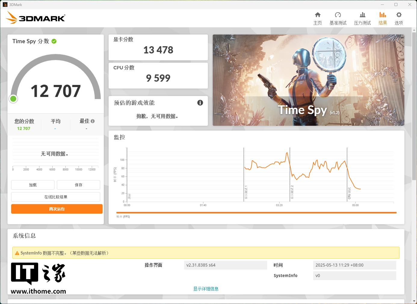 显卡方面,在 3D Mark 的 Time Spy DX12 测试中,显卡分数为 13478 分。