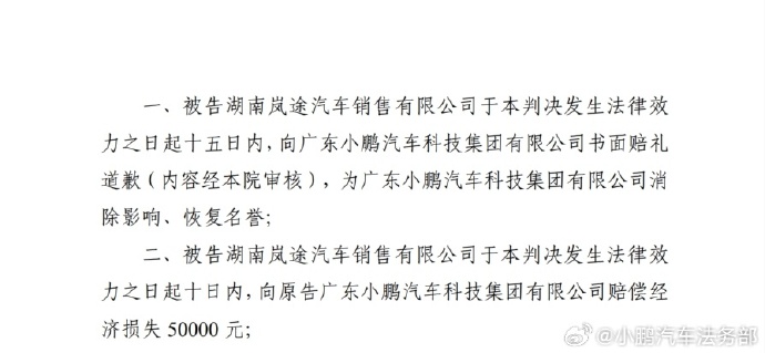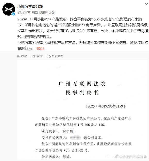 广州互联网法院就该网络侵权案件作出判决,认定其侵害了小鹏汽车的名誉权,判决其向小鹏汽车书面赔礼道歉,并赔偿经济损失。
