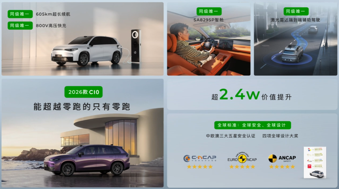 2026 款零跑 C10 还支持 3.3kW 220V 外放电 + 800V 高压充电,拥有同级唯一 SA8295P 智舱、同级唯一激光雷达端到端辅助驾驶,可满足露营、钓鱼、音乐会等户外场景使用。