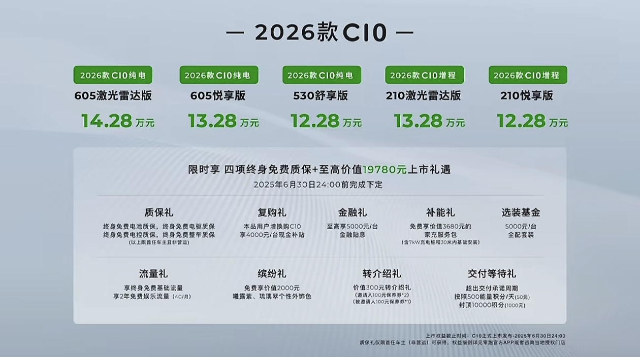 C10 纯电:605 激光雷达 14.28 万元;605 悦享版 13.28 万元;530 舒享版 12.28 万元