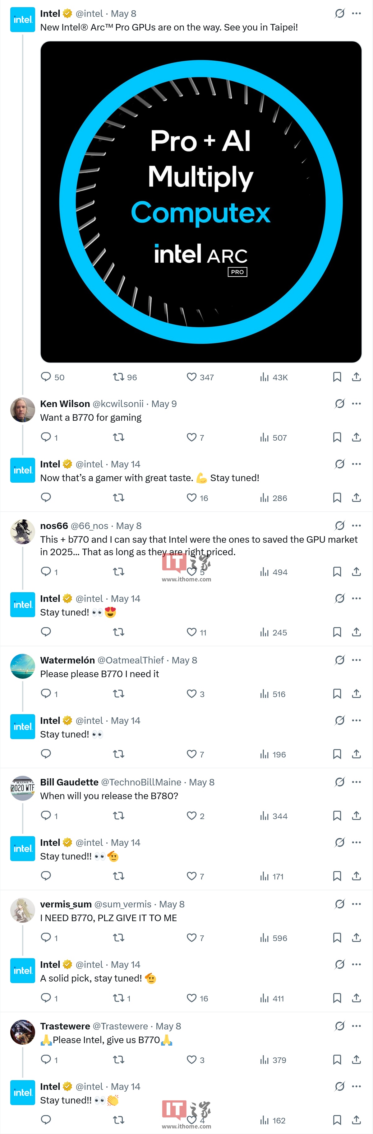 这条 X 平台动态下方多位网友表达了对英特尔中高端 "Battlemage" 架构消费级独立显卡产品(如 B770、B780 等可能型号)的期望,而英特尔官方 X 平台账户在昨日集中作出了 "Stay tuned!"(敬请期待!)的统一回复。