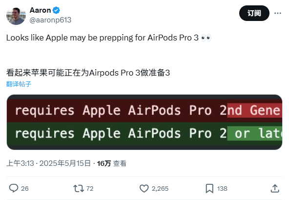 这一变化表明,某些适配 AirPods Pro 2 的功能也将适用于 AirPods Pro 3,苹果官方开发团队正在针对这一变化做准备。
