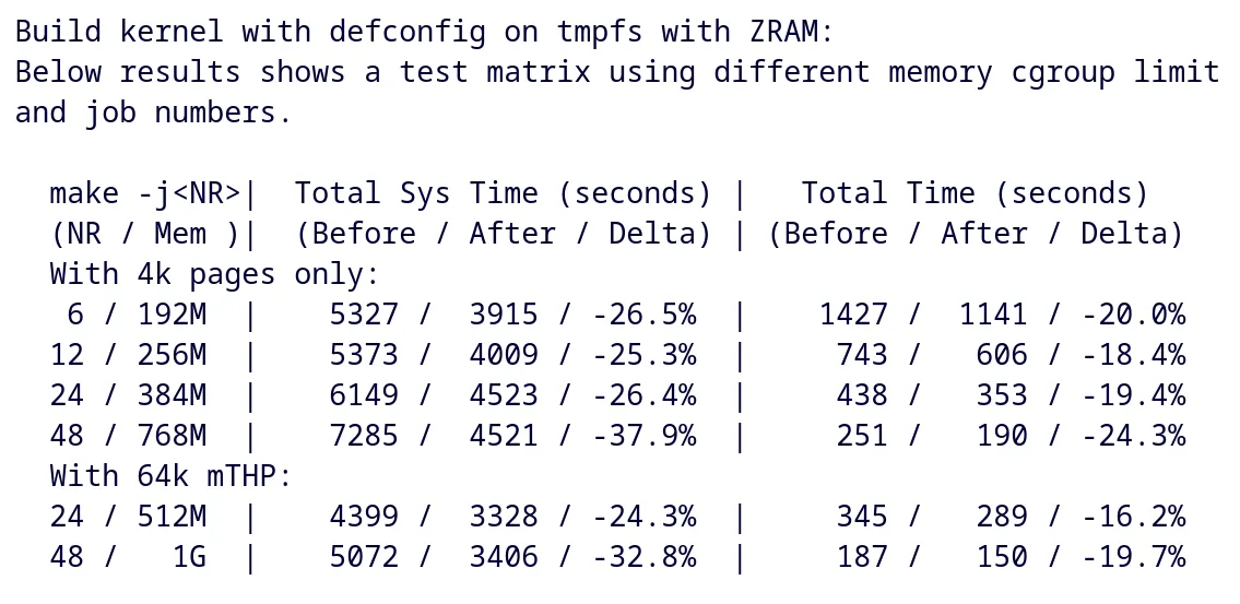 测试结果表明,无论是对 4K 页面还是 mTHP folios,Swap Table 在基础顺序交换到高负载工作场景下,均实现了约 20-30% 的性能提升。