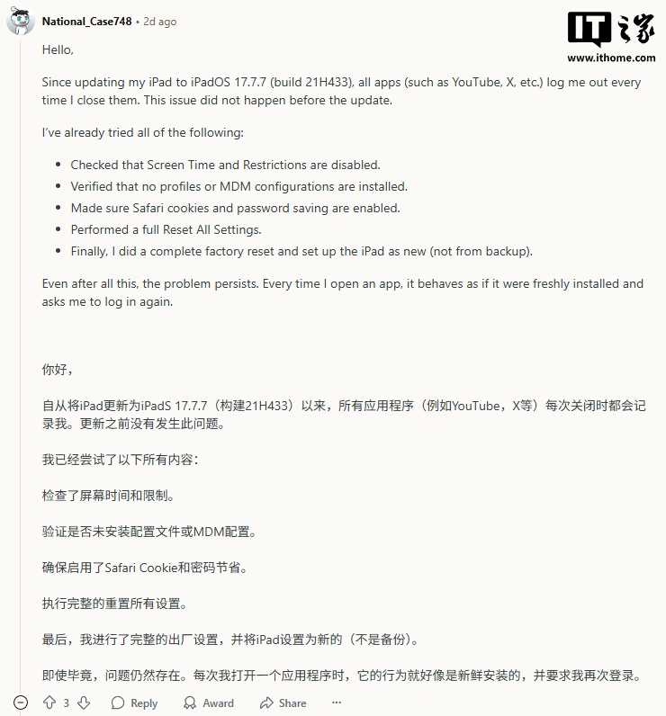 Reddit 用户 National_Case748 表示:尝试所有常规修复(包括禁用屏幕使用时间限制、验证 MDM 配置、启用 Safari Cookie 和密码存储、恢复出厂设置)后,异常登录问题仍然存在。