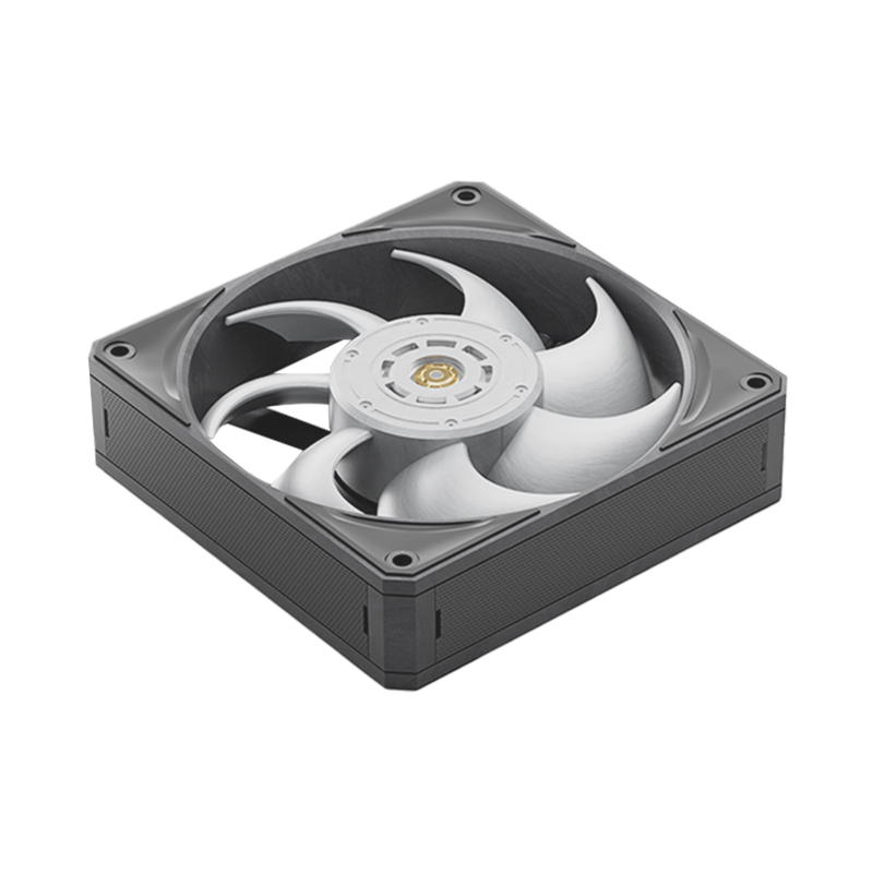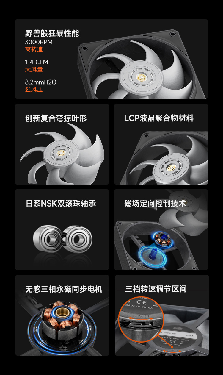 F9 R120 风扇拥有 7 片“非连续截面复合弯掠叶形”扇叶,搭载工业级三相六槽无感永磁电机和日系 NSK 双滚珠轴承,轴承中管采用高精度铜合金材质。